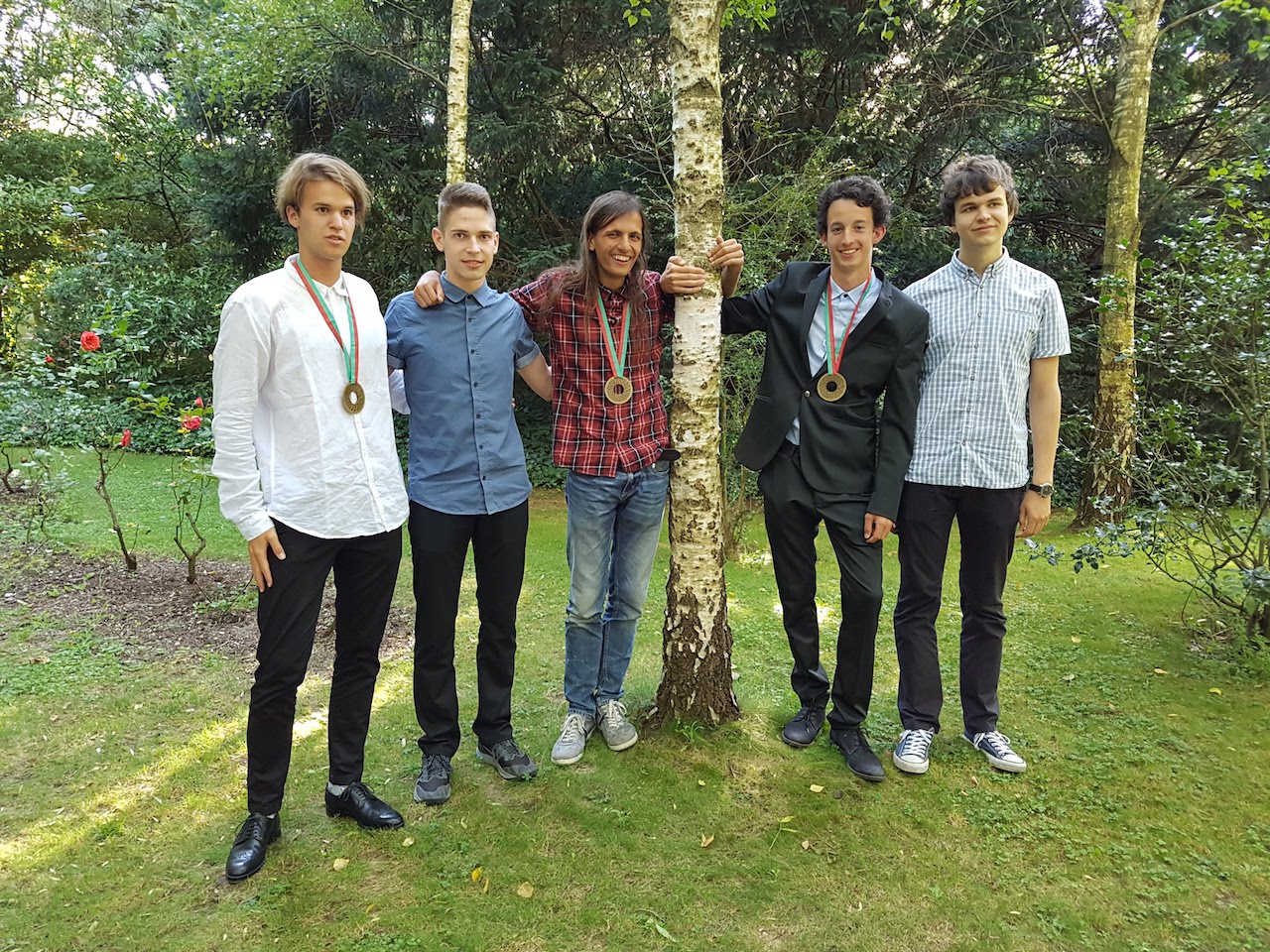 Na fotografiji so dijaki po svečani podelitvi medalj, ki je potekala v soboto, 29. julija 2018 v muzeju Gulbenkian, v parku muzeja.