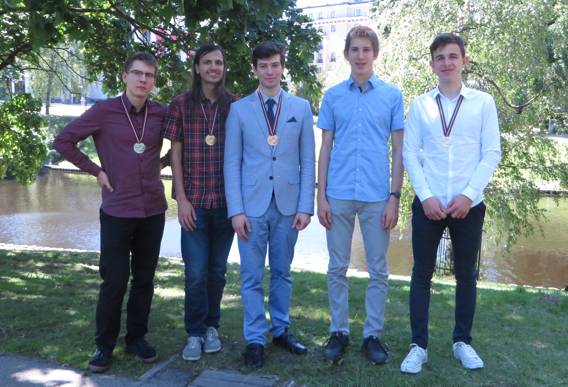 Slovenska ekipa je na olimpijadi dosegla fenomenalen uspeh. Marko Čmrlec in Tevž Lotrič sta v absolutni konkurenci vseh udeležencev (evropskih in gostov) osvojila 3. in 5. mesto ter zlati medalji, Andraž Jelinčič srebrno, Vladimir Smrkolj bronasto medaljo in najmlajši, Simon Bukovšek, pohvalo. Marko Čmrlec je prejel tudi posebno pohvalo za najboljši dosežek pri teoretičnem delu tekmovanja, kar je zgodovinski podvig, ki doslej ni uspel še nobenemu slovenskemu dijaku, čeprav se fizikalnih olimpijad udeležujemo že dolga leta. Marko Čmrlec in Tevž Lotrič se bosta poleti udeležila tudi Mednarodne matematične olimpijade, ki se bo odvijala v Bathu v Veliki Britaniji, po matematični olimpijadi se bo v začetku avgusta Marko udeležil Mednarodne olimpijade v astronomiji in astrofiziki na Blatnem jezeru na Madžarskem, Tevž Lotrič in Vladimir Smrkolj pa se bosta udeležila še 50. Mednarodne fizikalne olimpijade, ki bo drugi teden julija v Tel Avivu v Izraelu. V Rigo so dijaki z vodjema ekipe Jurijem Bajcem in Barbaro Rovšek pripotovali v petek, 31. maja. V soboto, 1. junija so od 9.30 do 14.30 eksperimentirali z radijskimi valovi; preučevali so potovanje radijskih valov skozi kovinske cevi in vodo ter določali koeficiente dušenja ter lomni količnik vode za to elektromagnetno valovanje. V nedeljo so z delom začeli ob 9.00 in 5 ur reševali 3 teoretične naloge: določali temperaturo zrn sodre v ozračju s temperaturnim obratom, računali tirnico kotaleče se enakomerno nabite krogle v homogenem magnetnem polju ter hitrost, s katero iz poljubno vrteče se šobe izteka voda, kar so lahko določili z analizo grafa, ki je prikazoval obliko izteklega curka v nekem trenutku. Besedilo nalog v angleščini je tukaj, tu pa še slovenski prevod teoretičnih nalog, eksperimentalne naloge in fotografija pripomočkov. |