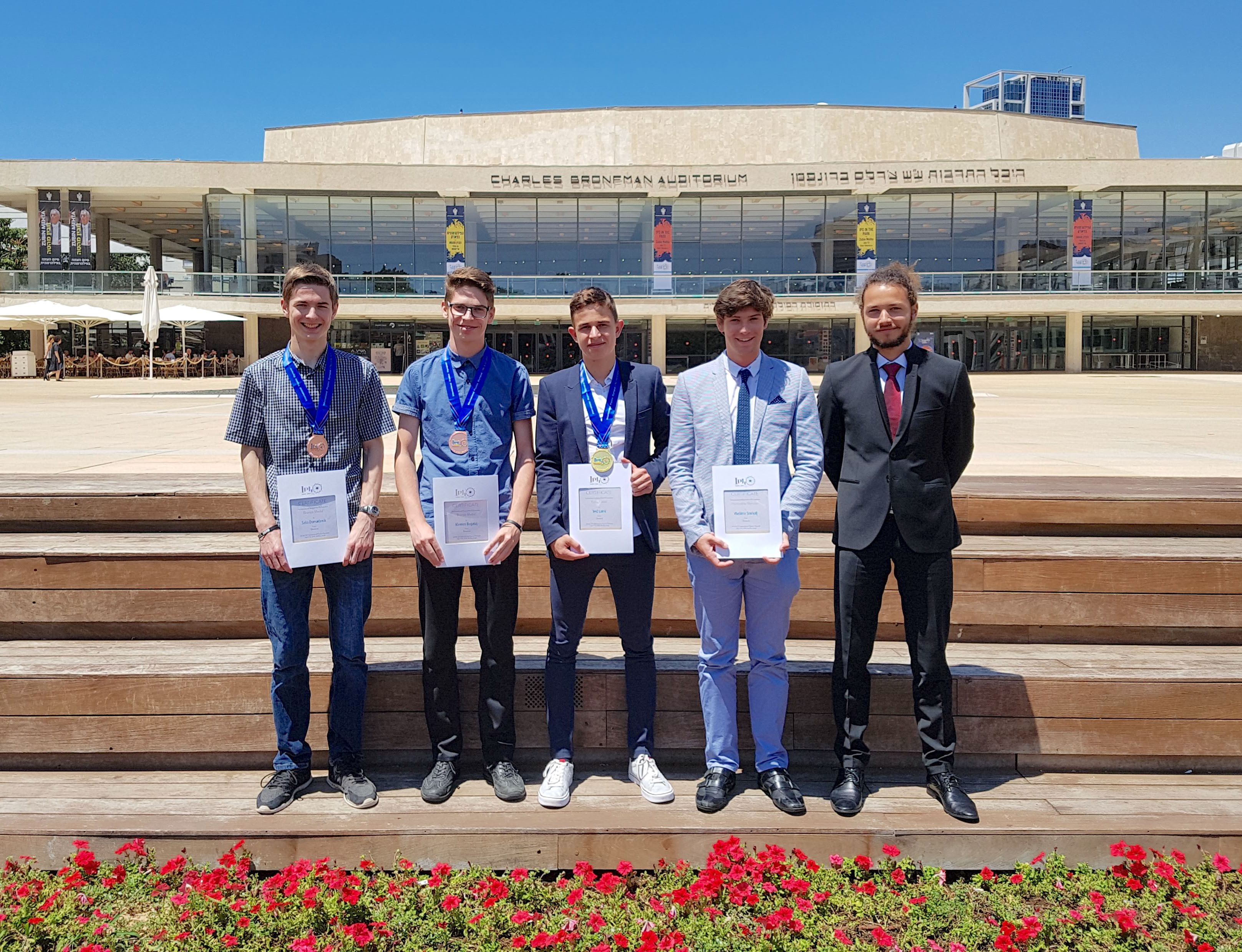 Tole so naši zmagovalci — z desne: Aleš, Vladimir, Tevž, Klemen in Sašo —, ovešeni z medaljami, 14. julija 2019 pod vročim izraelskim (malo čez) opoldanskim soncem na trgu Leonarda Bernsteina pred največjo koncertno dvorano v Tel Avivu, Avditoriumom Charlesa Bronfmana, domom Izraelskega simfoničnega orkestra, potem ko so večer prej na istem trgu nastopili prav ti filharmoniki pod dirigentsko palico svojega maestra Zubina Mehte, na odprtem koncertu, s katerim so počastili 50 letnico — ne Mednarodne fizikalne olimpijade, ampak glasbenega udejstvovanja omenjenega slavnega dirigenta. Prav lepo naključje, in še lepše bi bilo, če bi bili mi tudi takrat na trgu. Aha, seveda, zaključna slovesnost je potekala prav v tej imenitni dvorani!