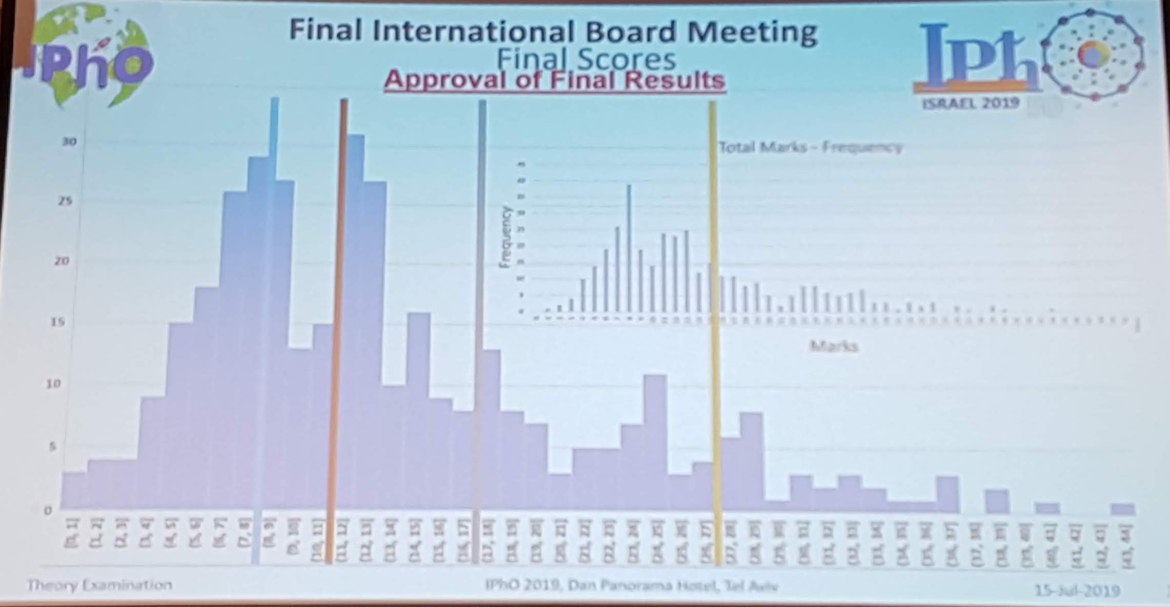 Kar se olimpijade tiče, pa takole: tekmovalne naloge so bile super težke, ampak to ni nič hudega, ker so bile za vse enake. Porazdelitev po skupnih točkah je na sliki, vseh možnih je bilo 50, 30 za 3 teoretične naloge in 20 za 2 eksperimentalni nalogi. Svetlo modra črta označuje mejo točk za pohvale, oranžna za bronasto medaljo, siva za srebrno medaljo in rumena za zlato. Zlato medaljo je prejelo 34 tekmovalcev (od, kot smo že povedali, 360, in Tevž je bil 17.)