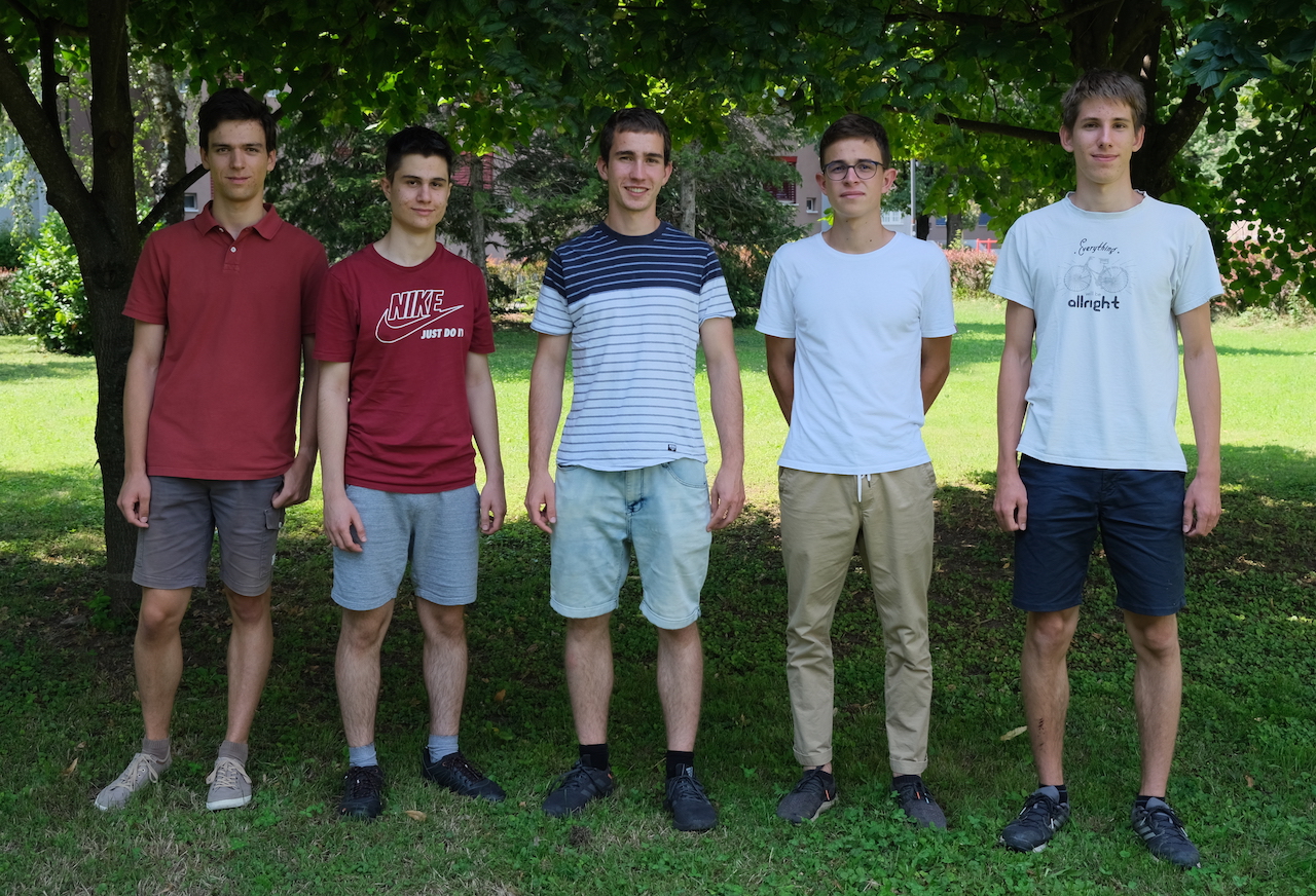 Tole so naši tekmovalci po 2., eksperimentalnem delu tekmovanja, na zelenici pred Pedagoško fakulteto v Ljubljani: Gregor, Job, Lev, Tevž in SImon (z leve proti desni).