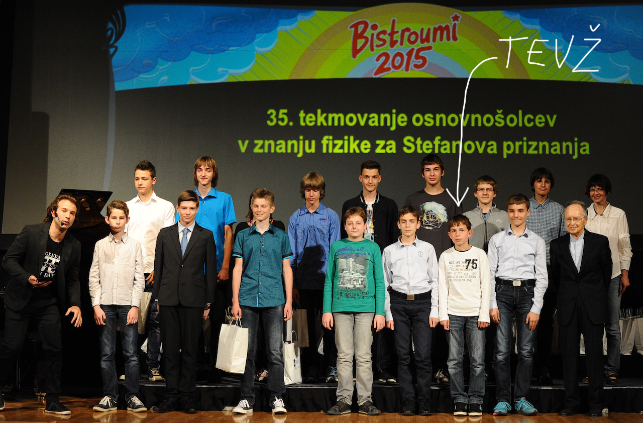 Našli smo 5 let staro fotografijo, na kateri je Tevž maja 2015: na prireditvi Bistroumi je prejel nagrado za osvojeno 1. mesto na 35. Državnem tekmovanju osnovnošolcev v znanju fizike v 8. razredu (potem je prvo mesto osvojil še v 9. razredu, naslednje leto). Nagrade je leta 2015 podeljeval prof. Janez Strnad. (Na fotografiji je poleg Tevža še nekaj članov 'bodočih' olimpijskih ekip.)