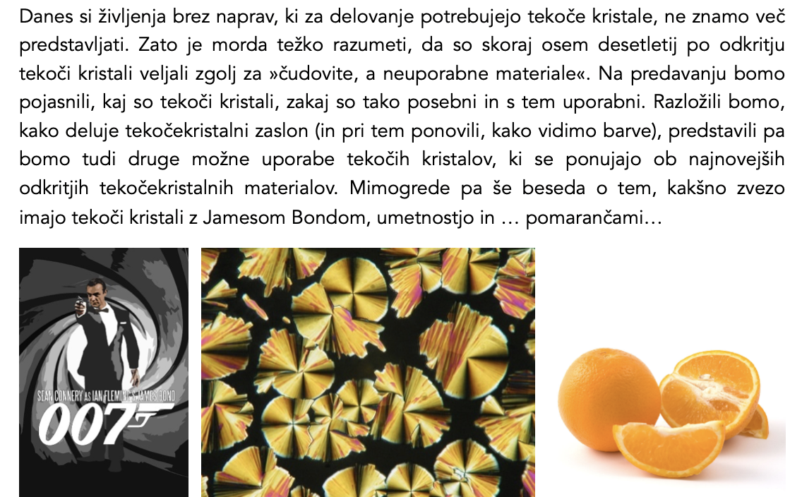Na Fakulteti za naravoslovje in matematiko v Mariboru bo Nataša Vaupotič (s Fakultete za naravoslovje in matematiko UM) izvedla predavanje z naslovom Kristali, ki tečejo.