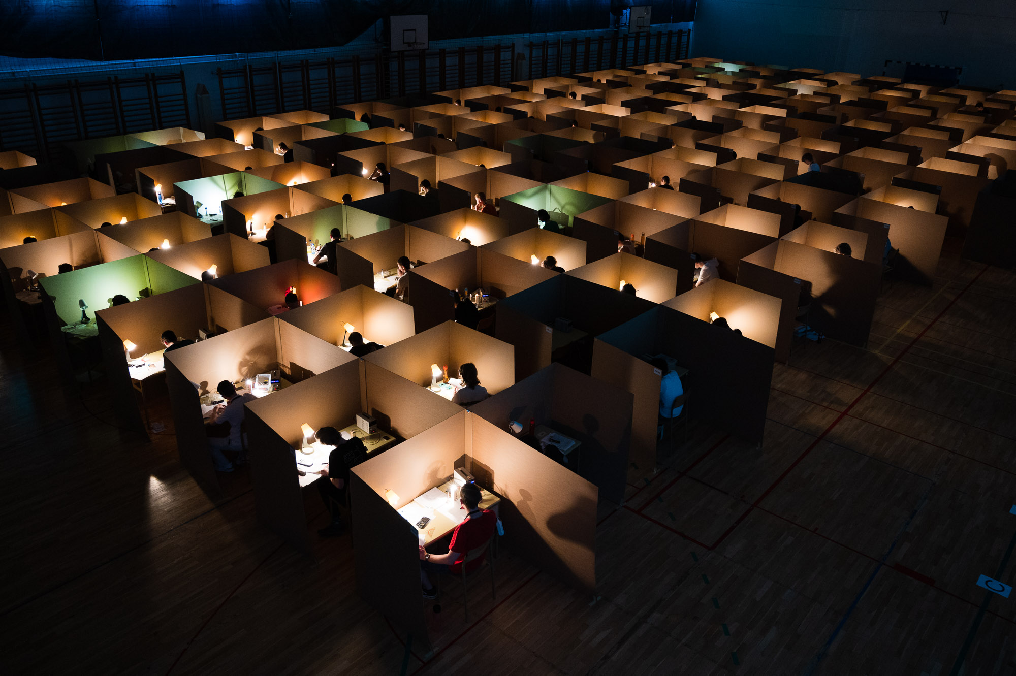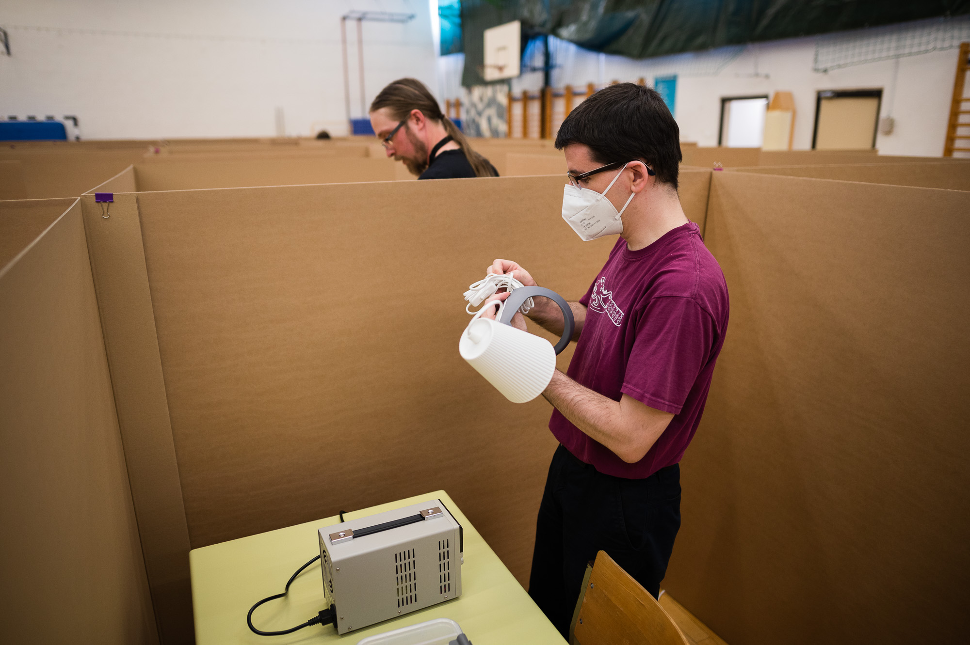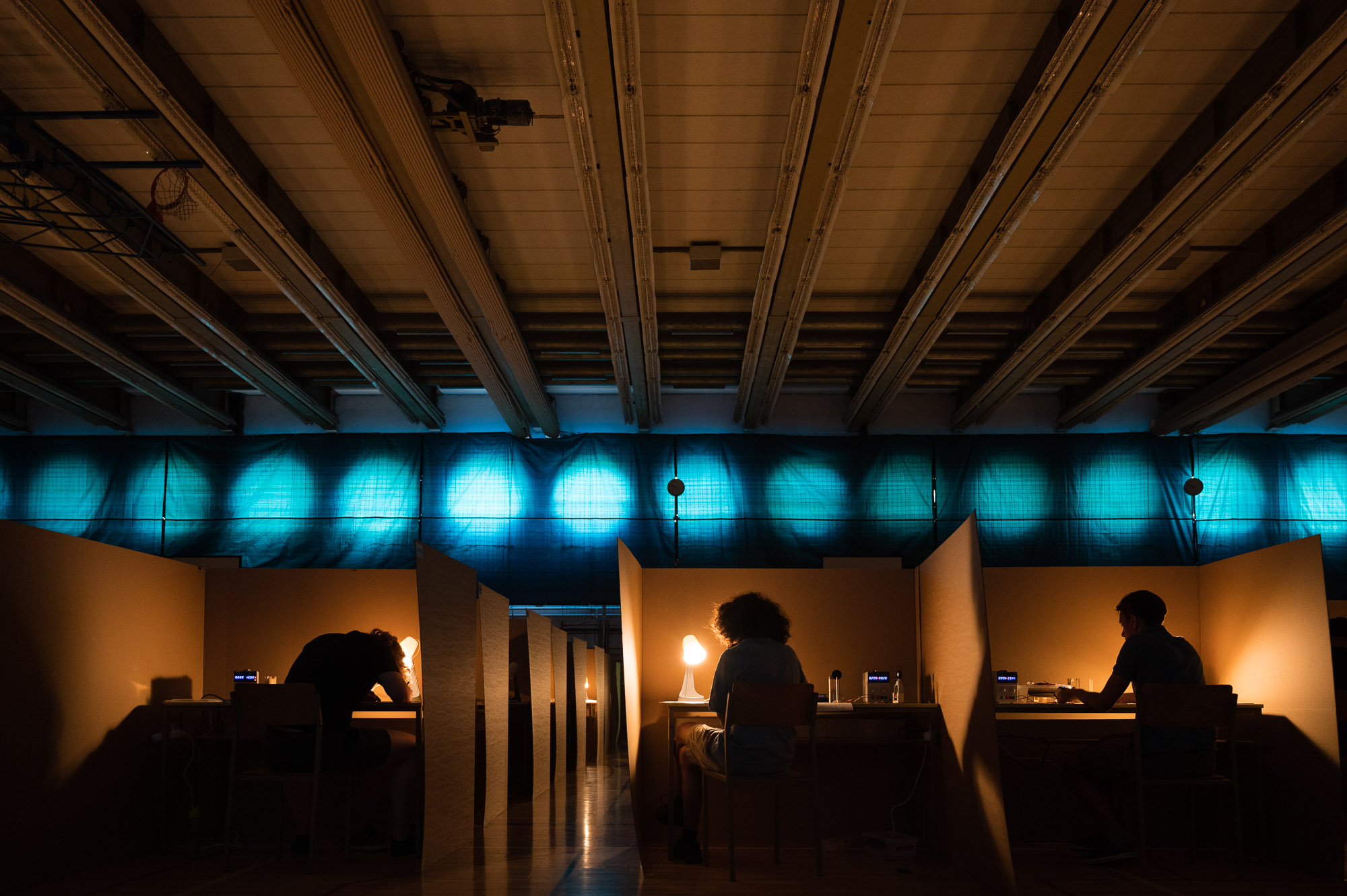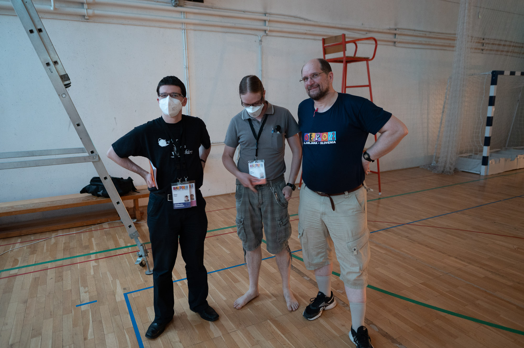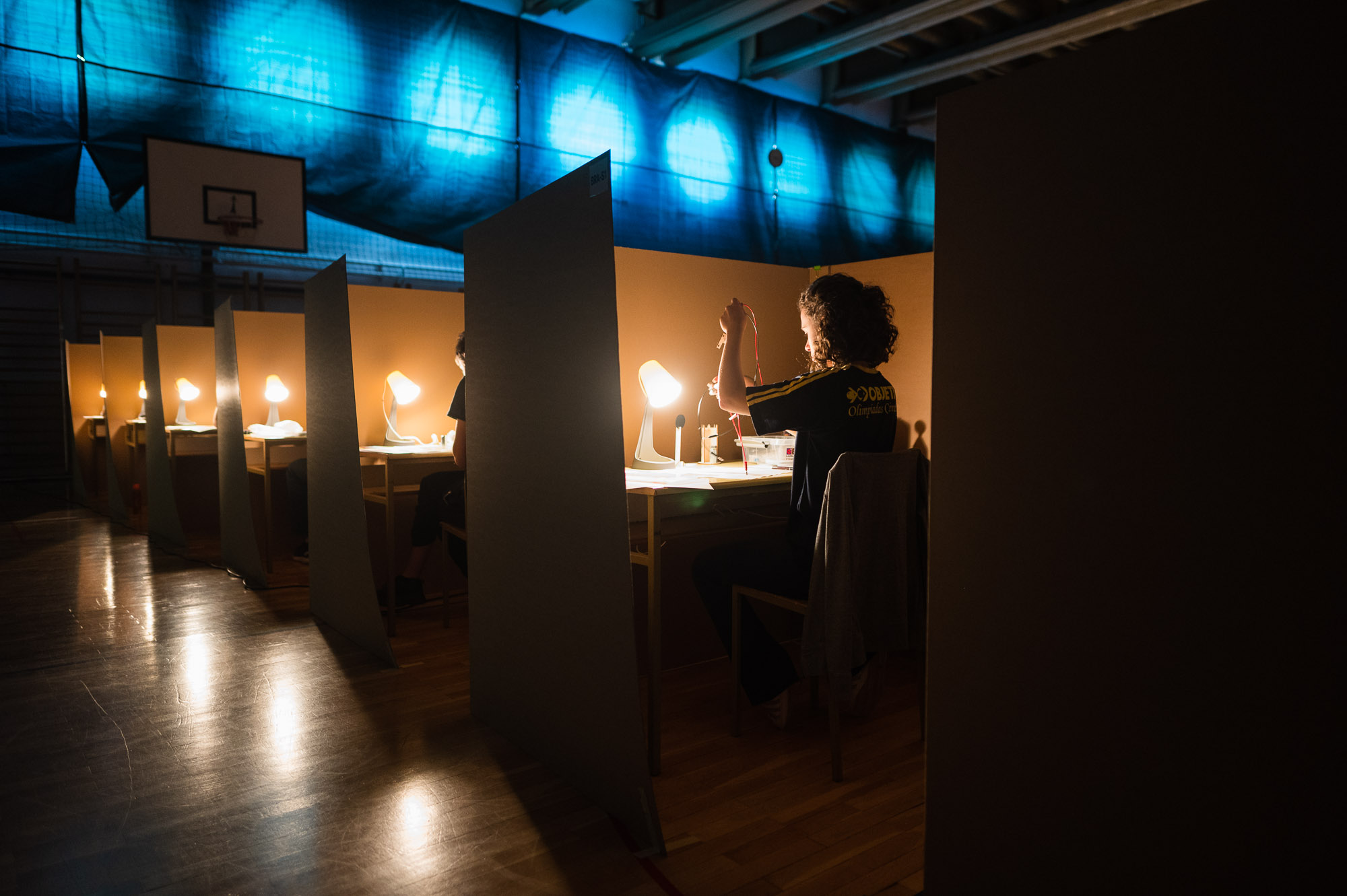 Da smo zmanjšali vpliv svetlobe iz okolice na meritve, smo telovadnico zatemnili, kolikor smo jo lahko; prizorišče je bilo filmsko! Fotografa dogajanja Jan Šuntajs in Vojko Opaškar sta odlično opravila z izzivom.