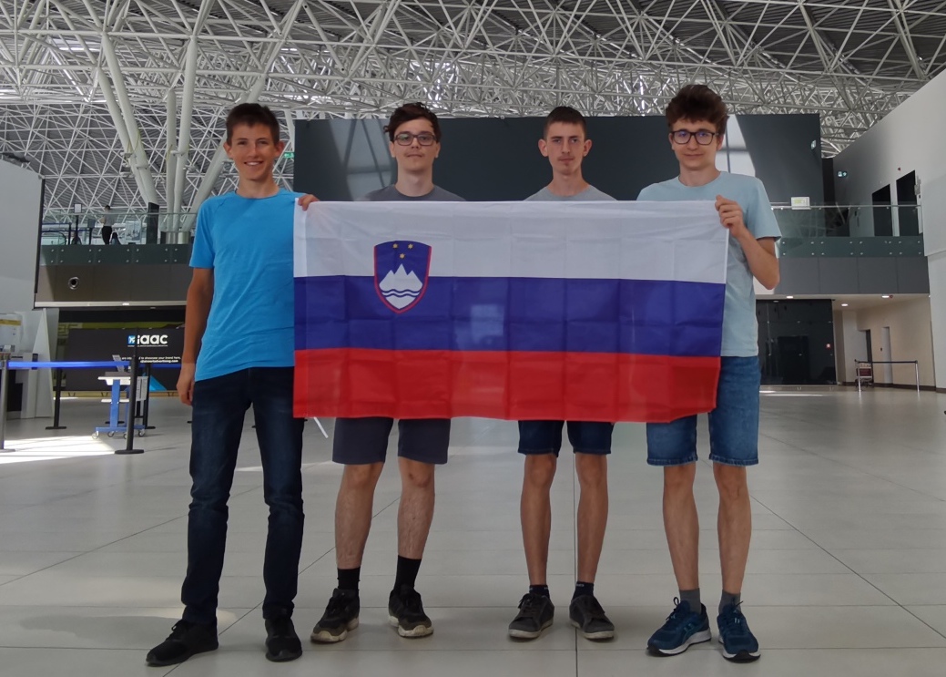 Na fotografiji so 4 člani ekipe (Domen je ostal doma in tekmoval na daljavo) na letališču pred odhodom v Hamburg, z leve: Žan, Miha, Peter in Alexander.