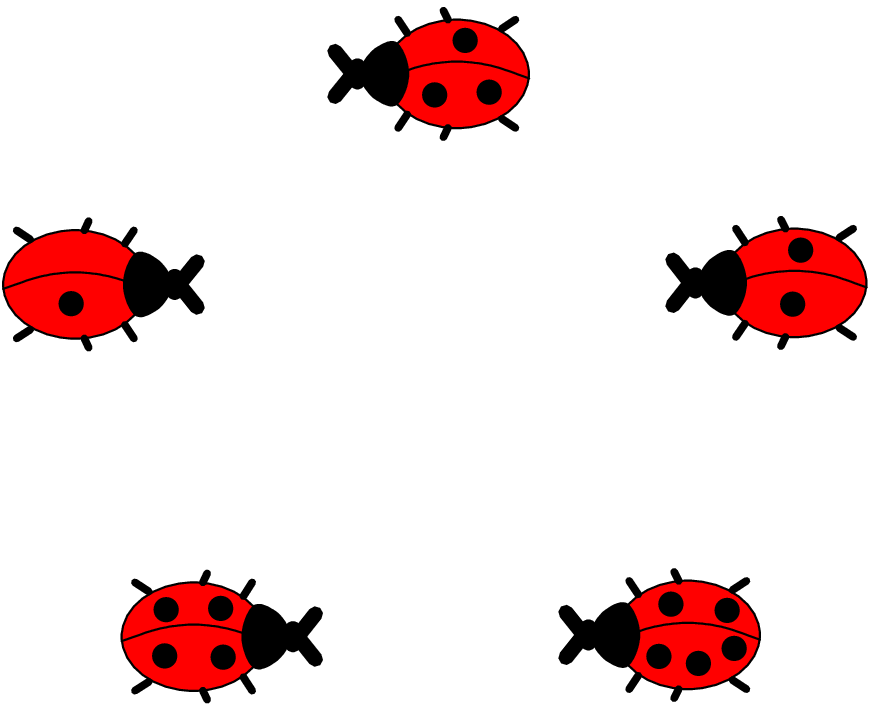 Ana je narisala 5 pikapolonic (glej sliko). Nato je s črto povezala vse narisane pikapolonice. Najprej je narisala črto od pikapolonice z 1 piko do pikapolonice z 2 pikama, nato je črto nadaljevala do pikapolonice s 3 pikami, pa do pikapolonice s 4 pikami in še do pikapolonice s 5 pikami.