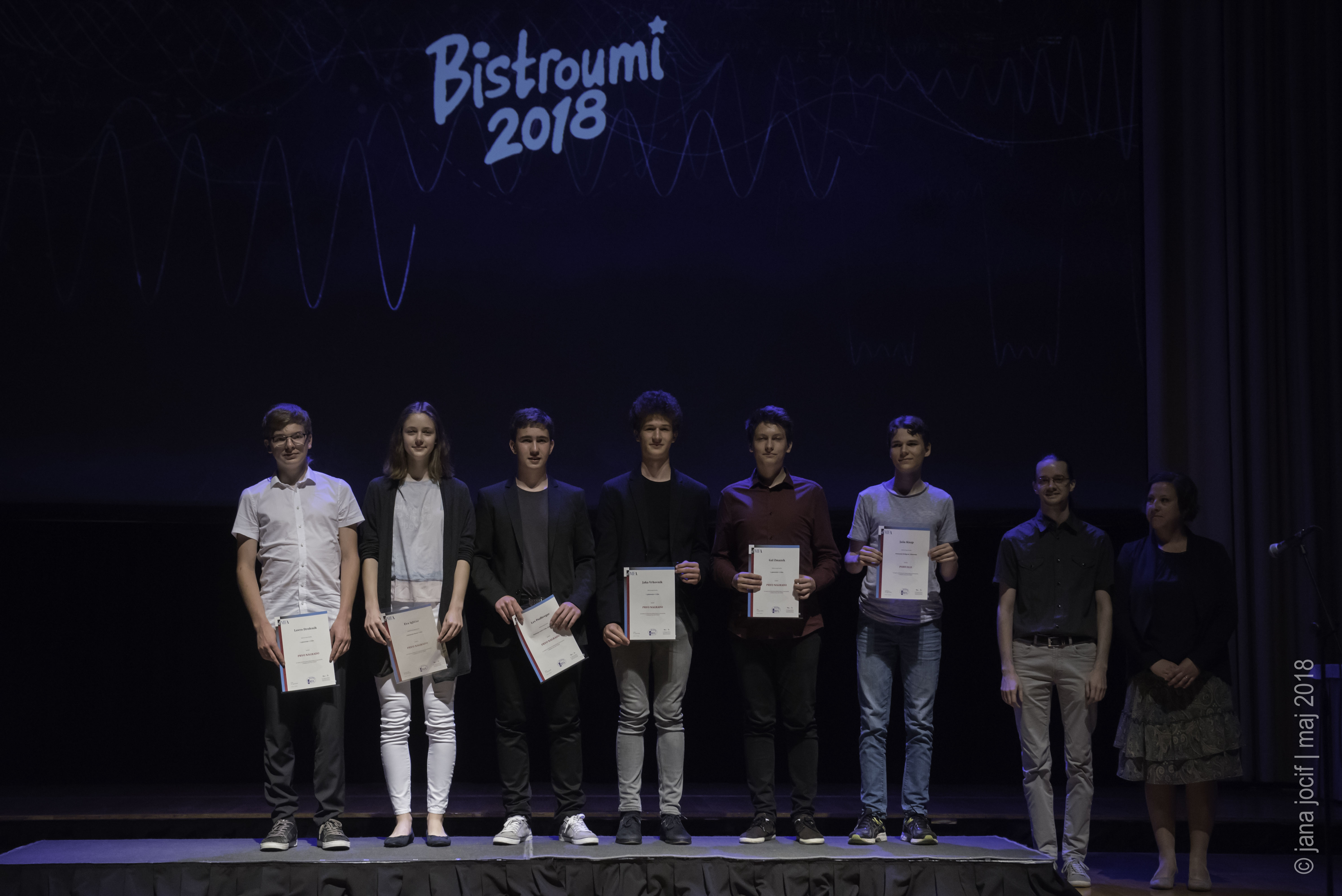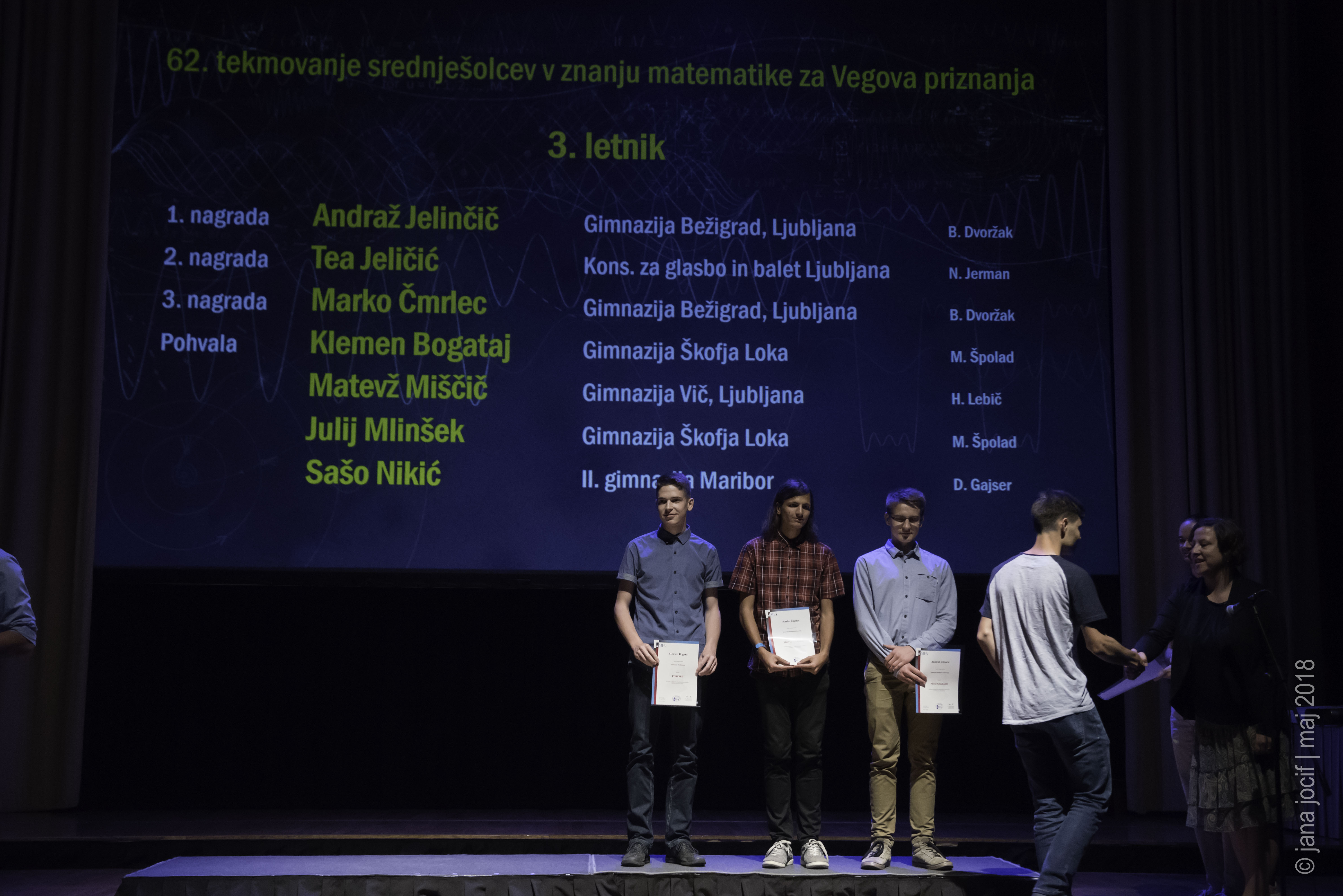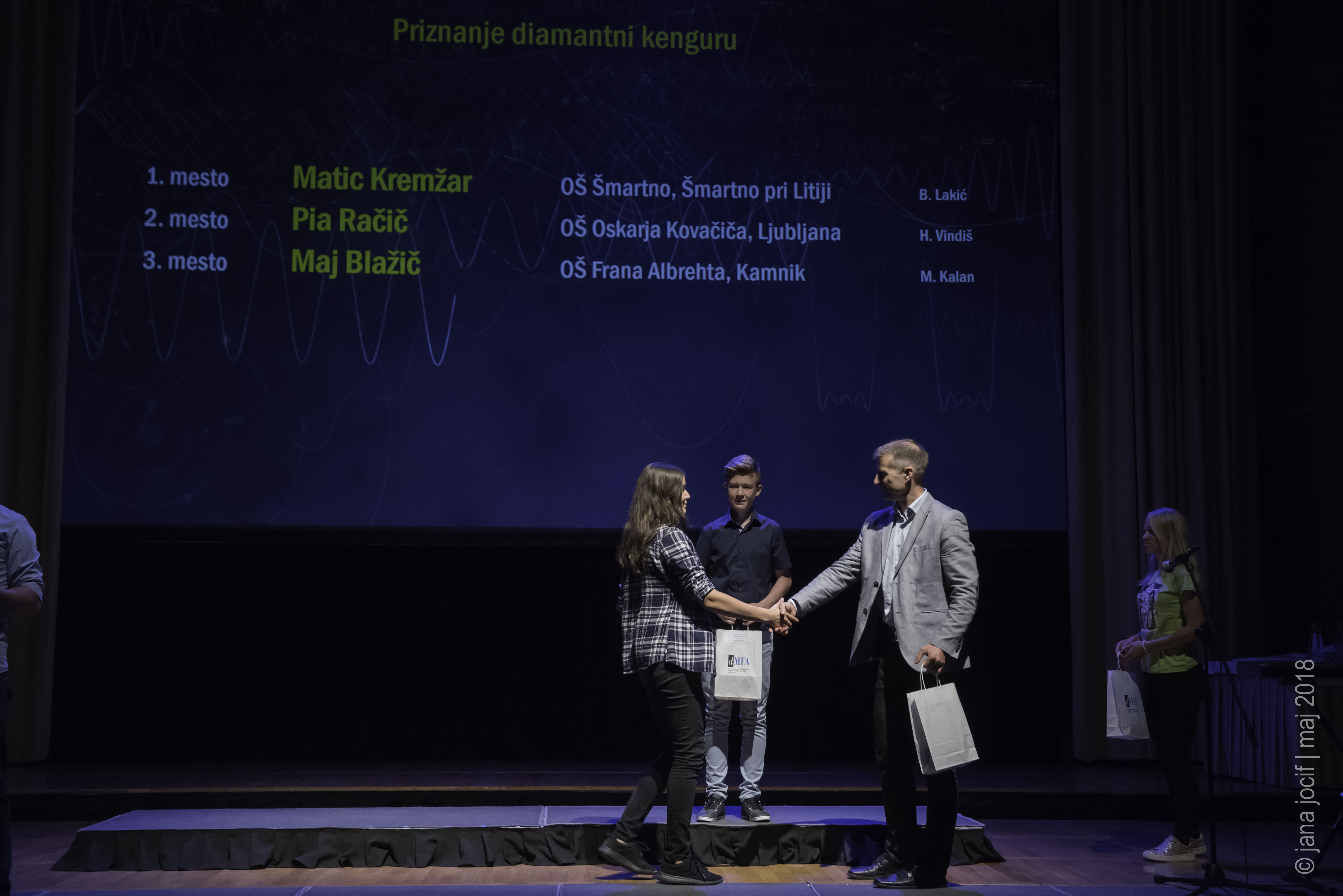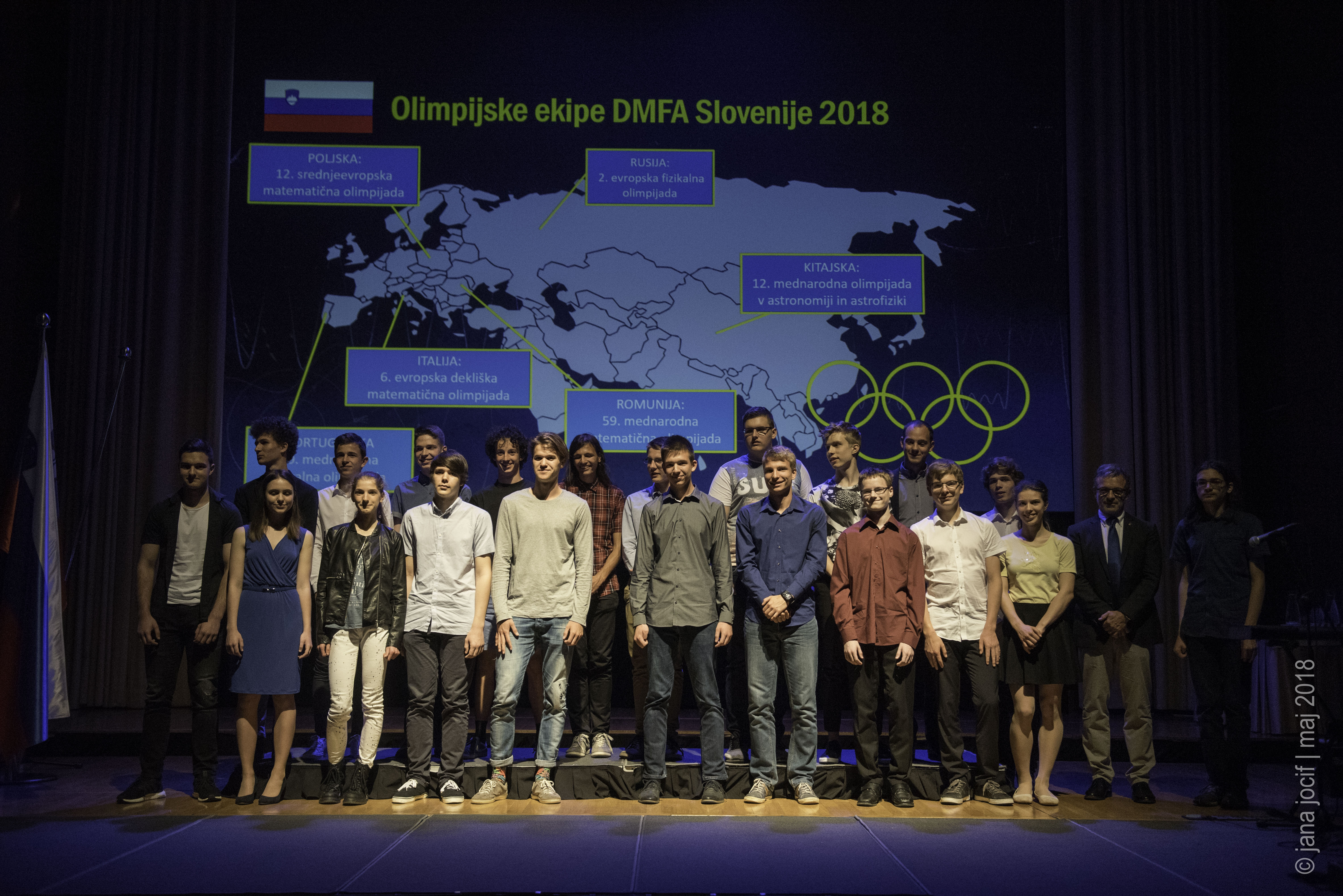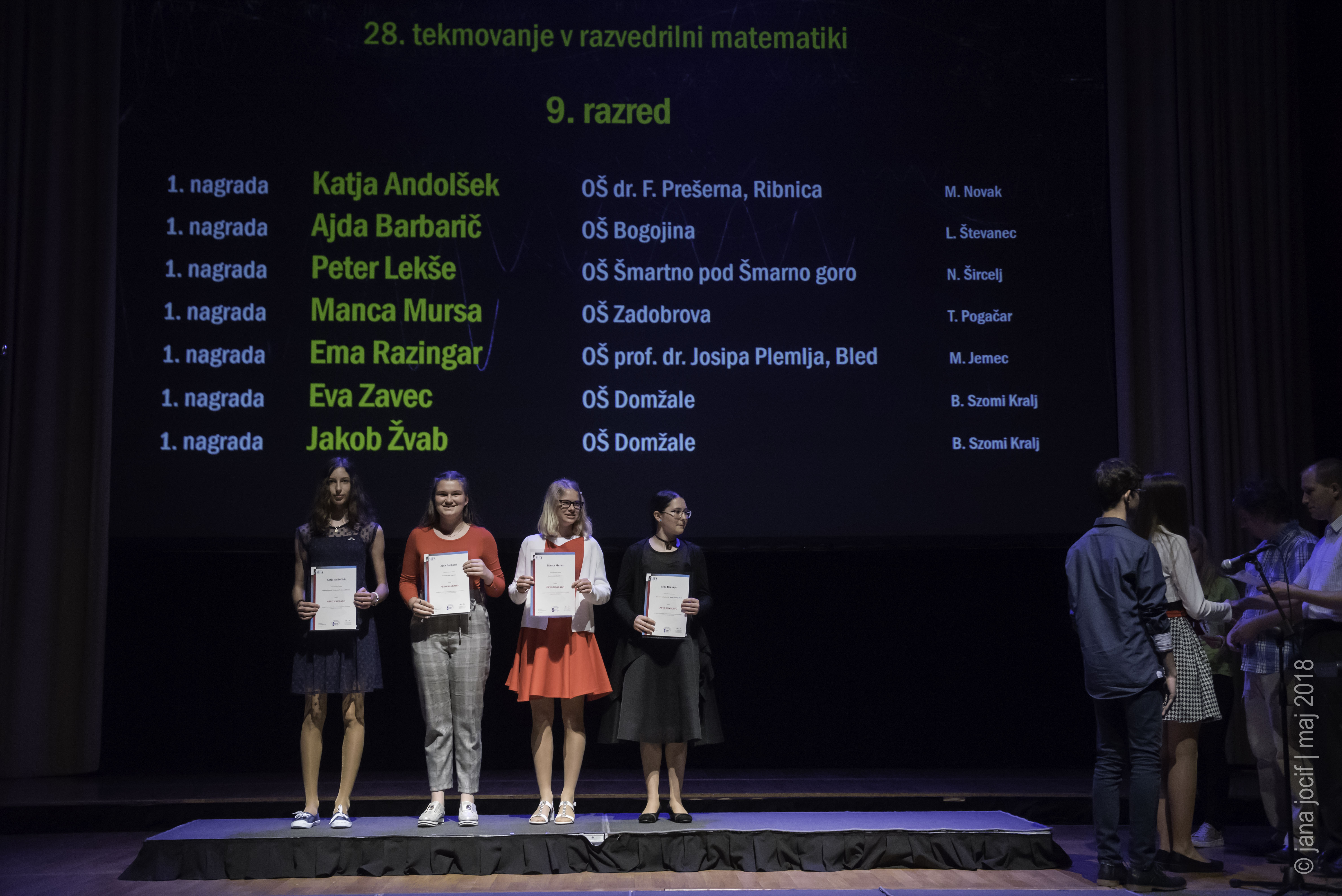 DMFA Slovenije dovoljuje shranitev slik v elektronski obliki in uporabo v individualne namene nagrajenih tekmovalcev. Uporaba posameznih slik na spletnih straneh šol ali v šolskih publikacijah je dovoljena, navesti je potrebno vir slik s povezavo na spletno stran DMFA Slovenije: <a href="http://www.dmfa.si/" title="DMFA Slovenije">www.dmfa.si</a>. Avtor slik: Jana Jocif.