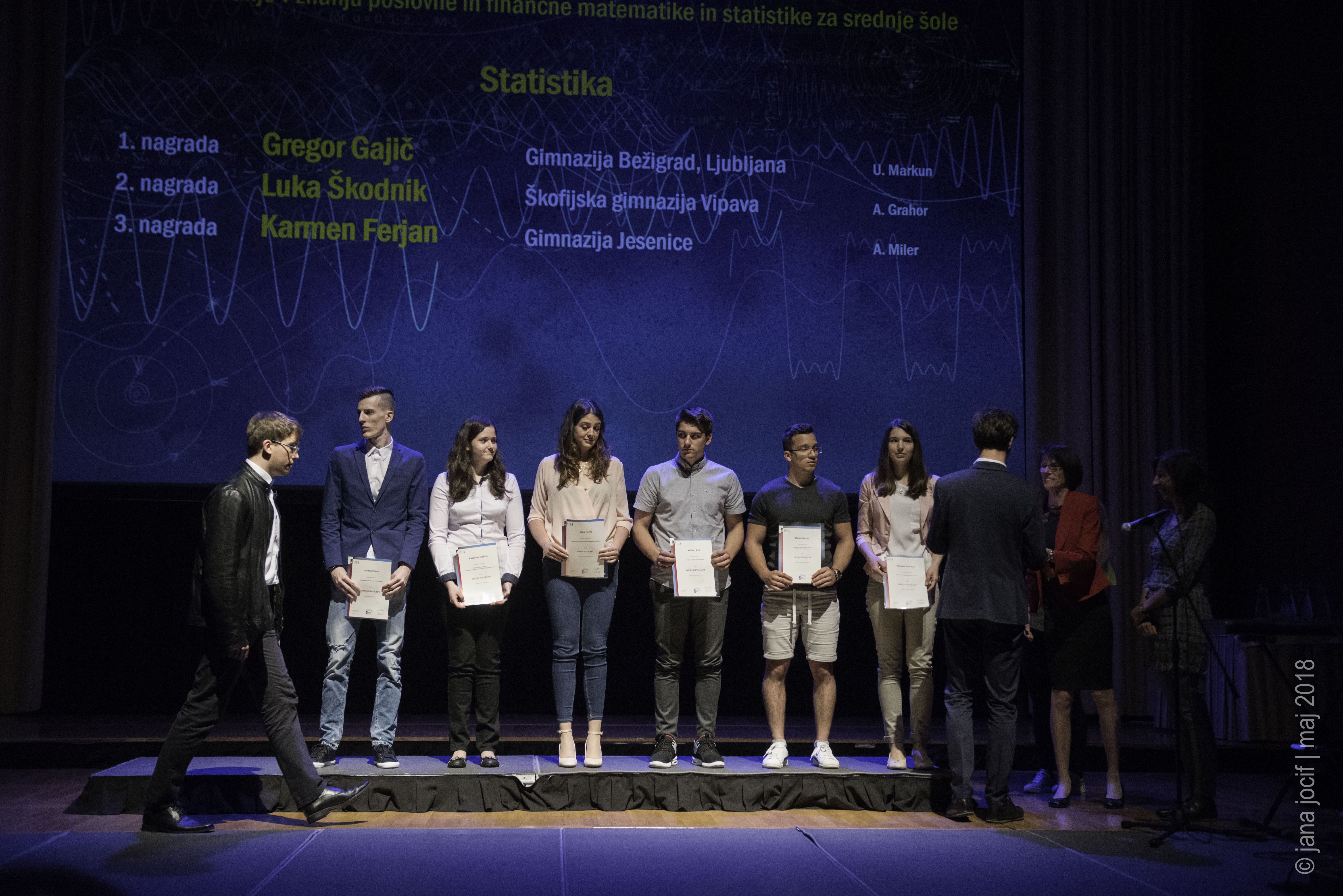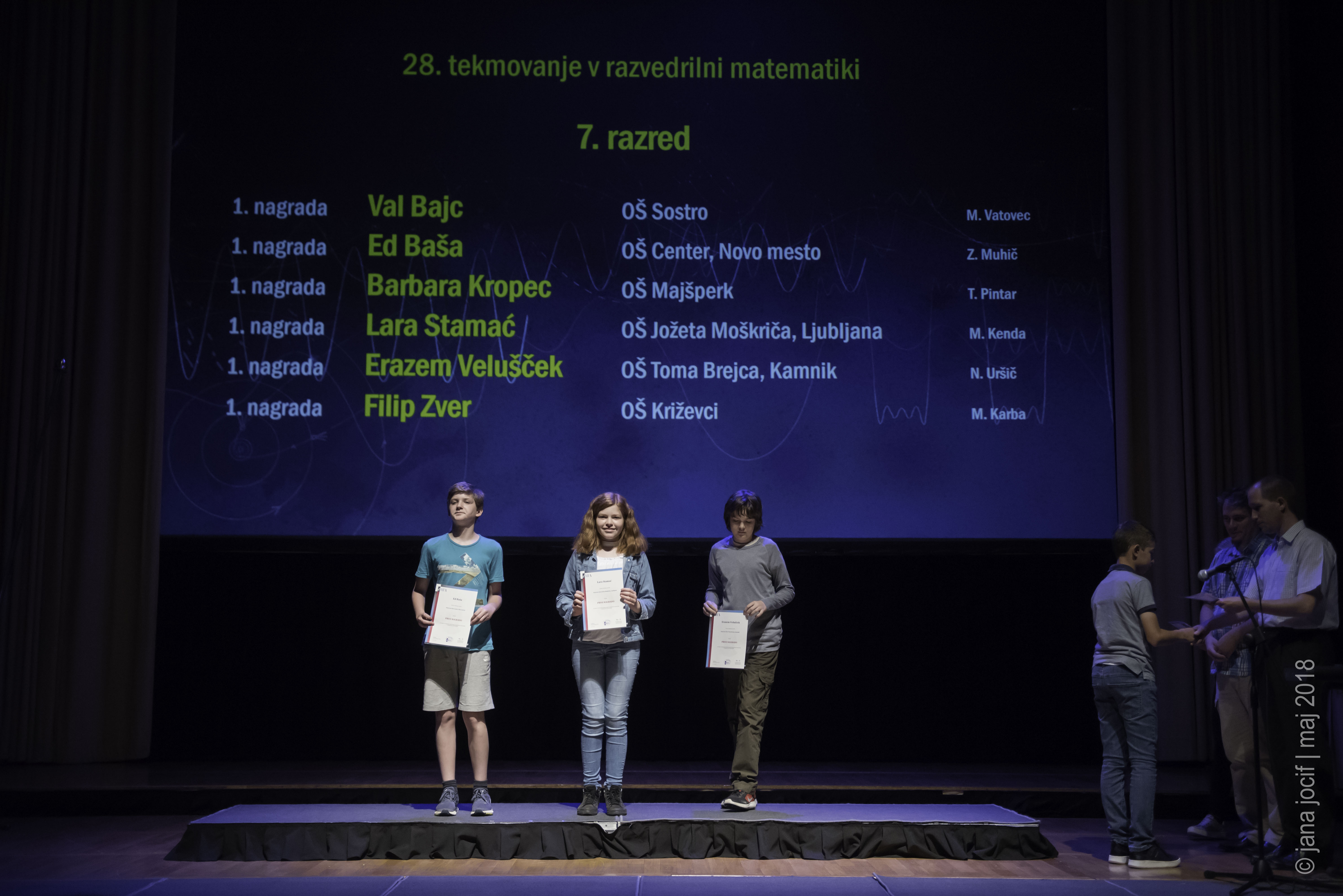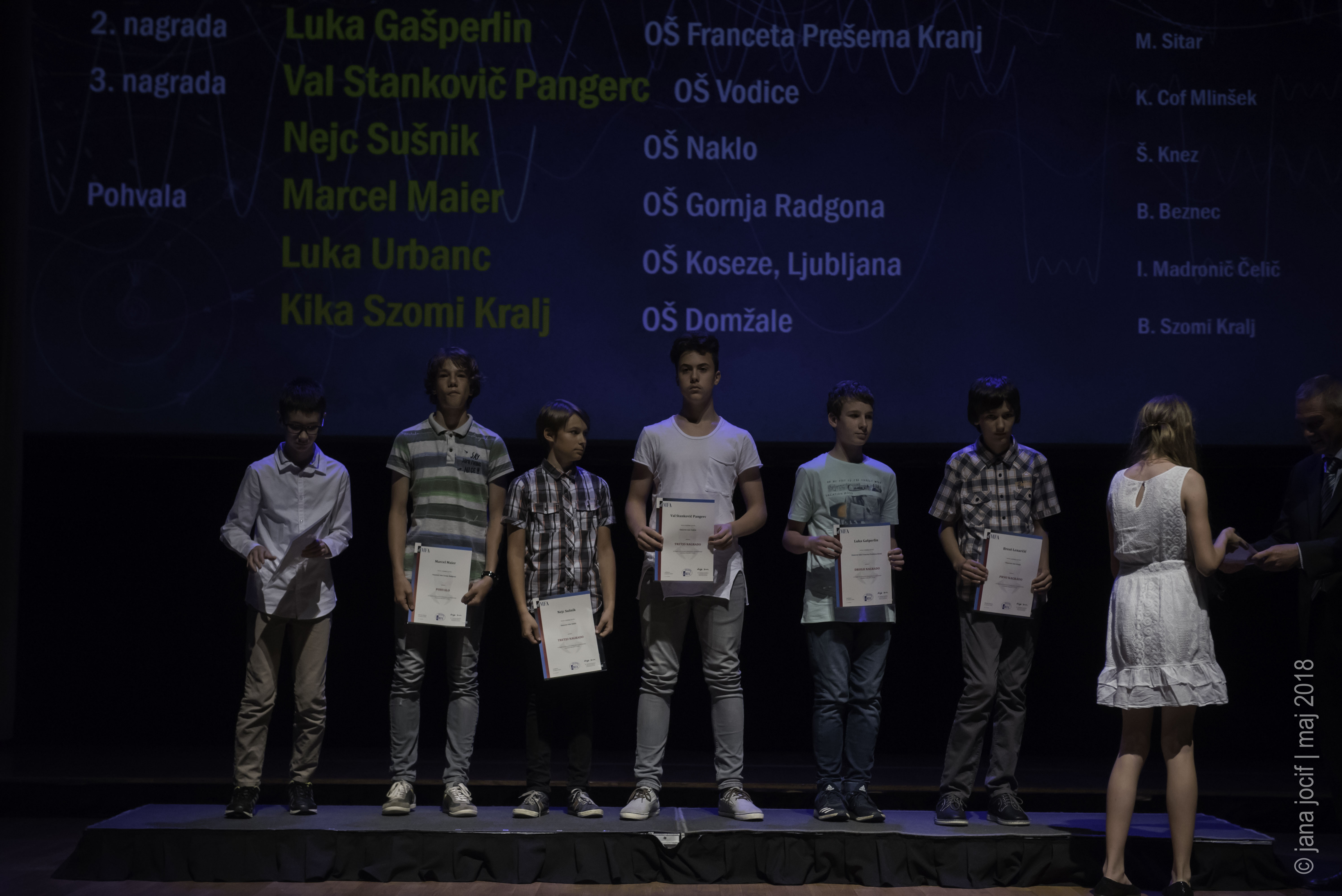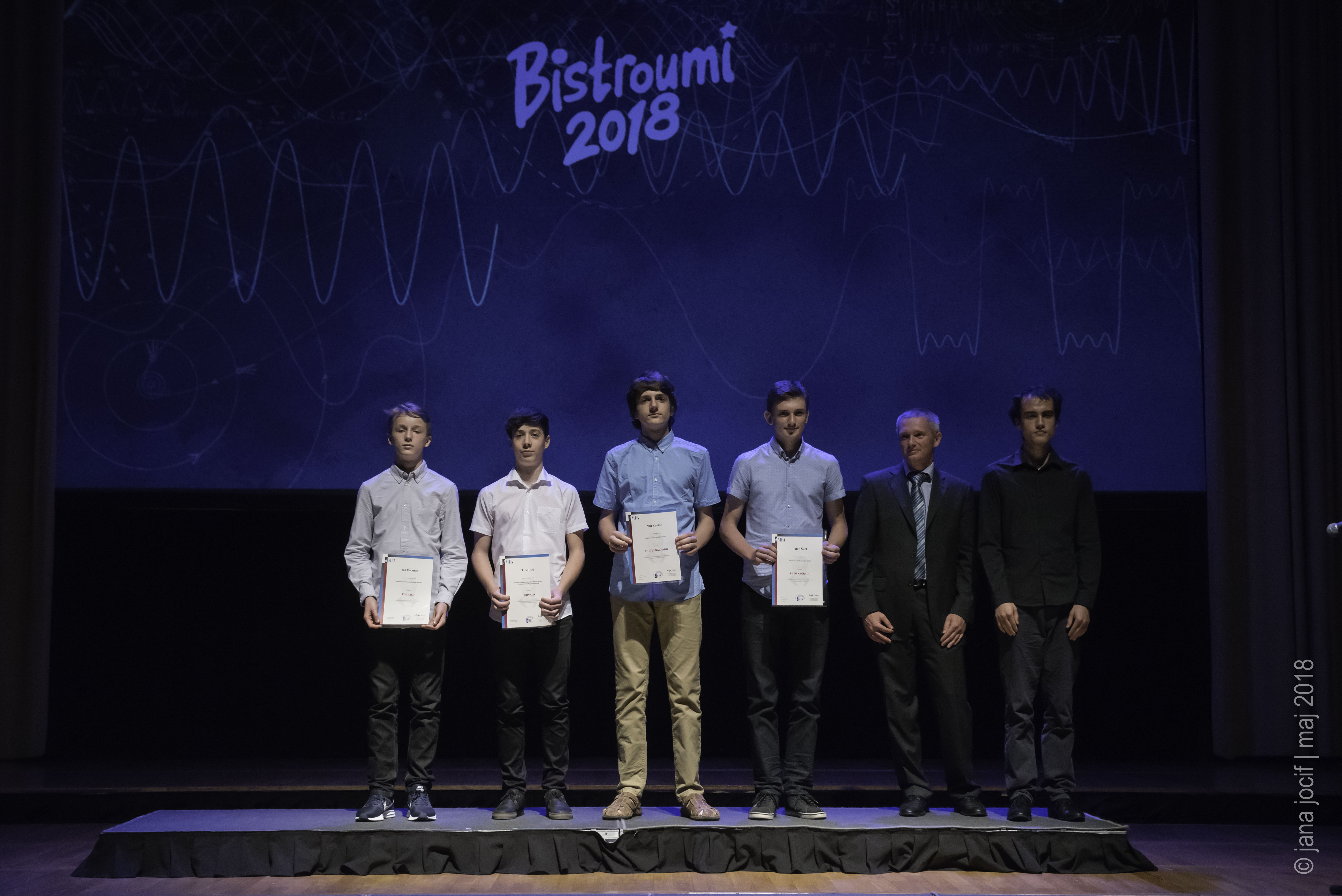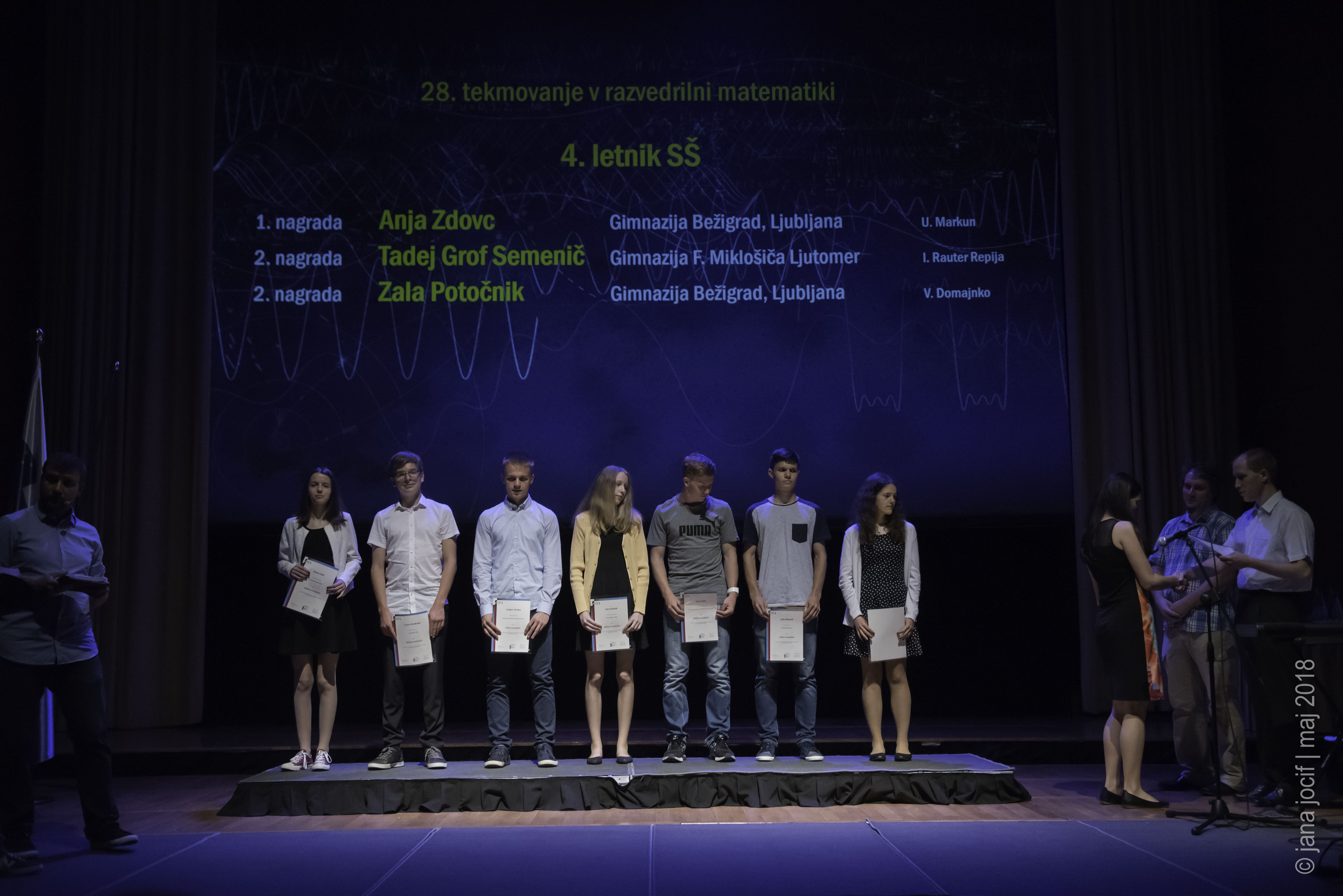 DMFA Slovenije dovoljuje shranitev slik v elektronski obliki in uporabo v individualne namene nagrajenih tekmovalcev. Uporaba posameznih slik na spletnih straneh šol ali v šolskih publikacijah je dovoljena, navesti je potrebno vir slik s povezavo na spletno stran DMFA Slovenije: <a href="http://www.dmfa.si/" title="DMFA Slovenije">www.dmfa.si</a>. Avtor slik: Jana Jocif.