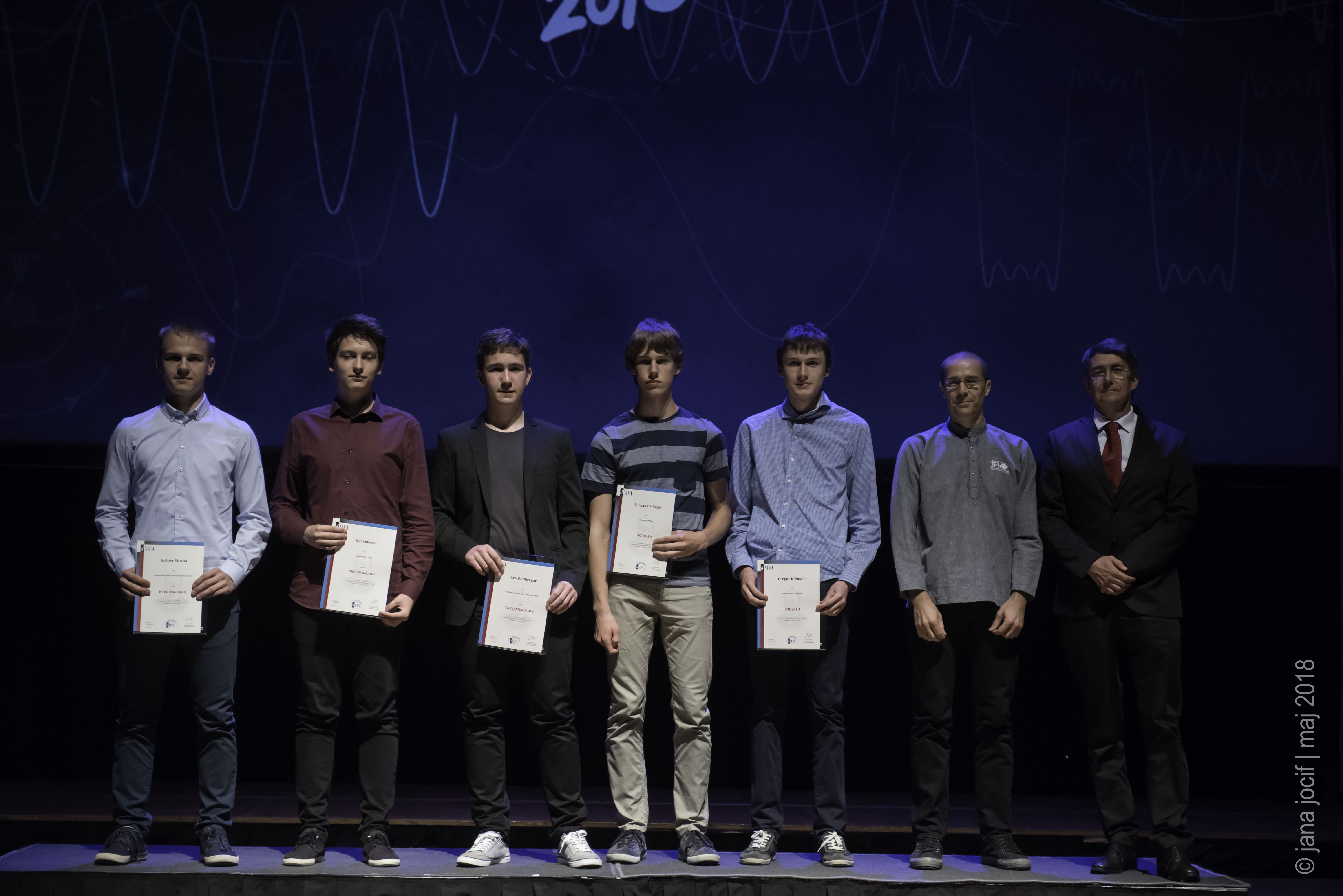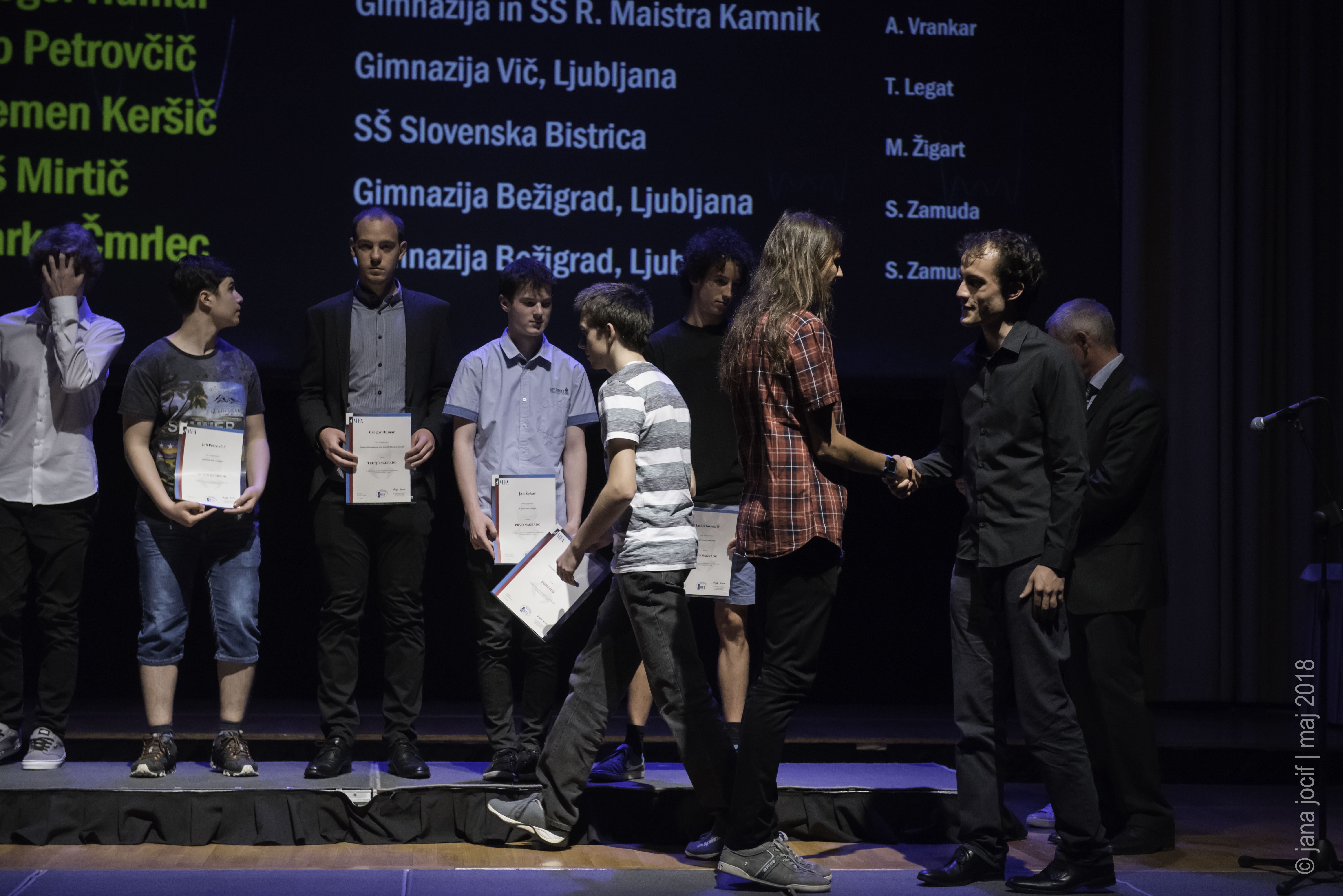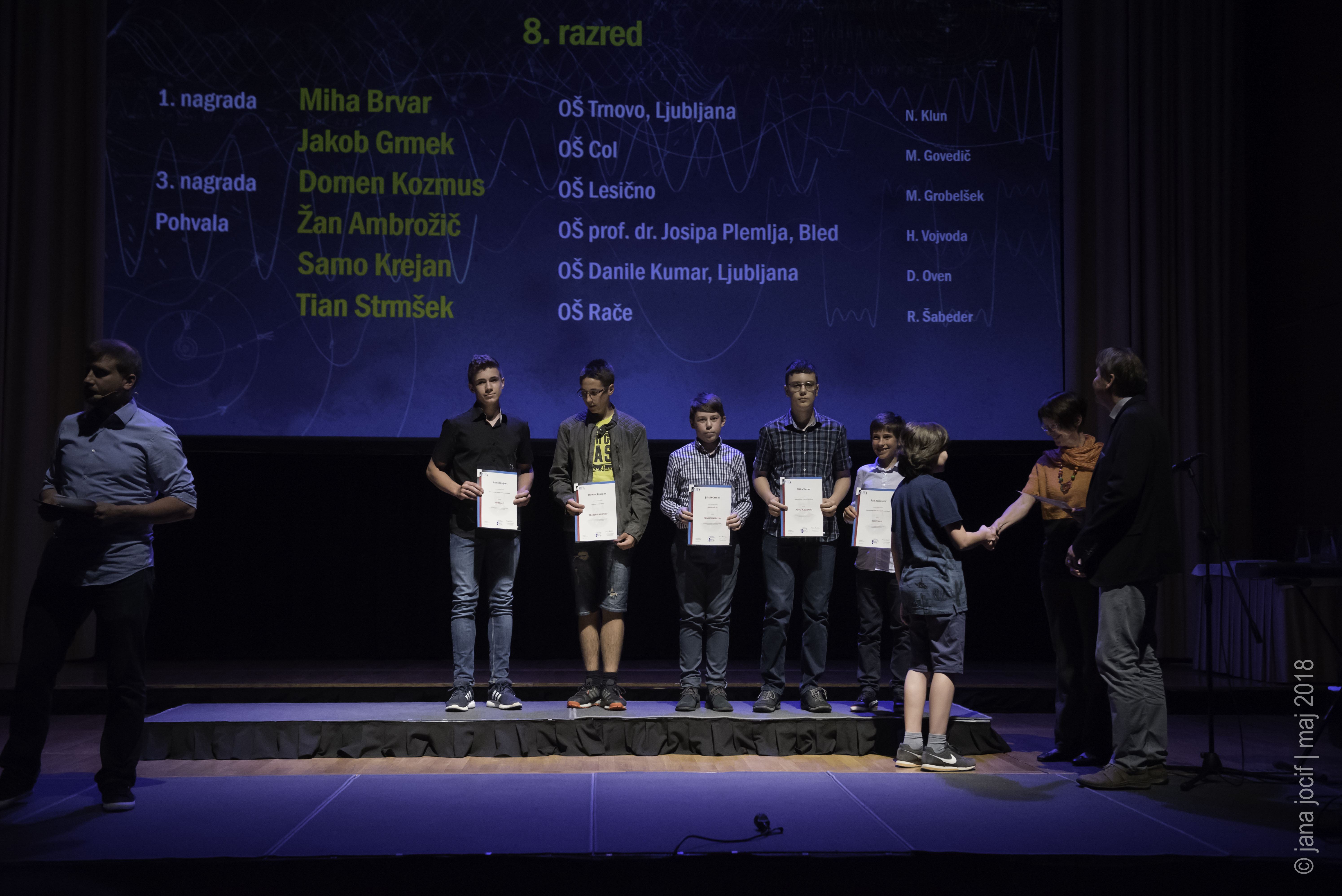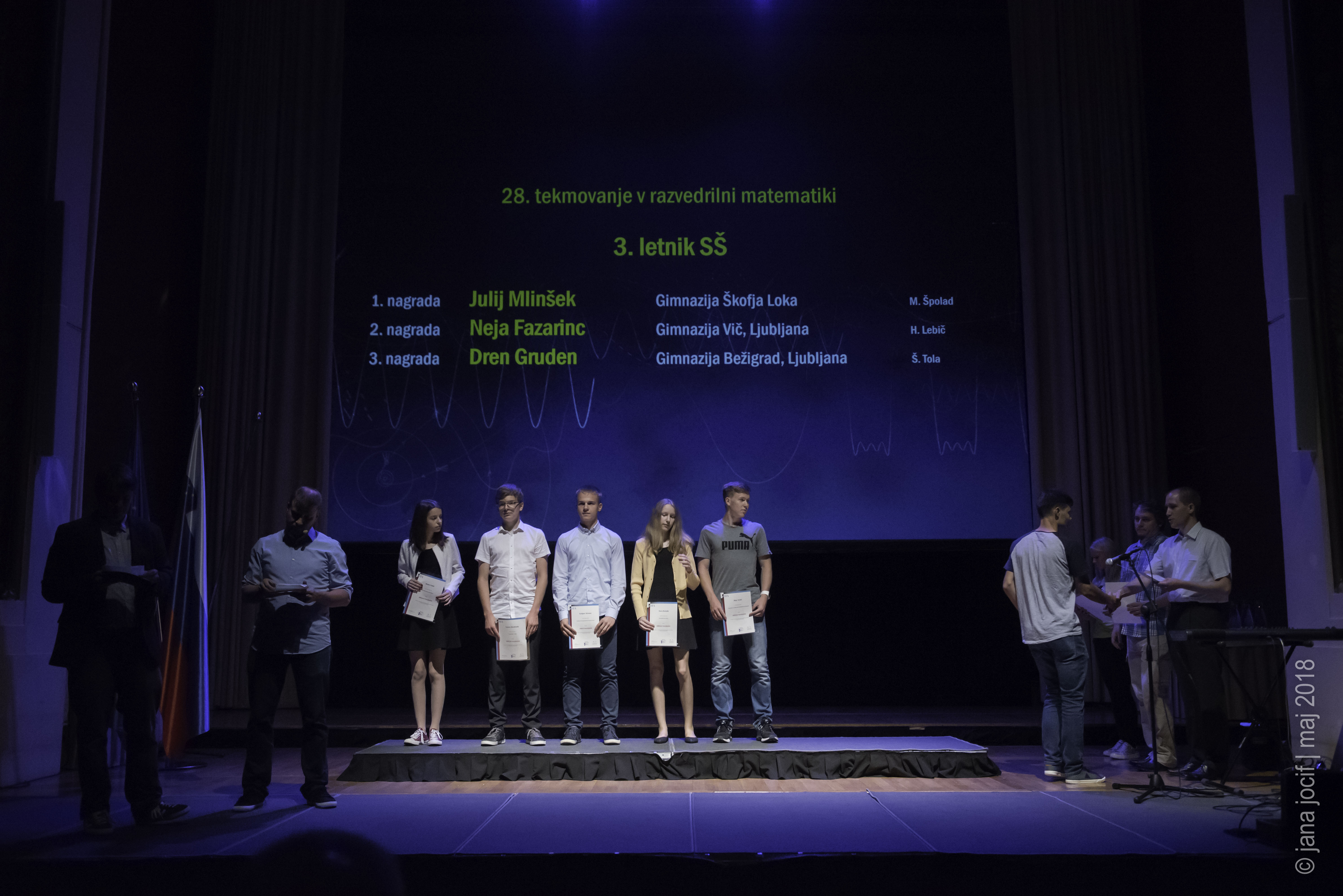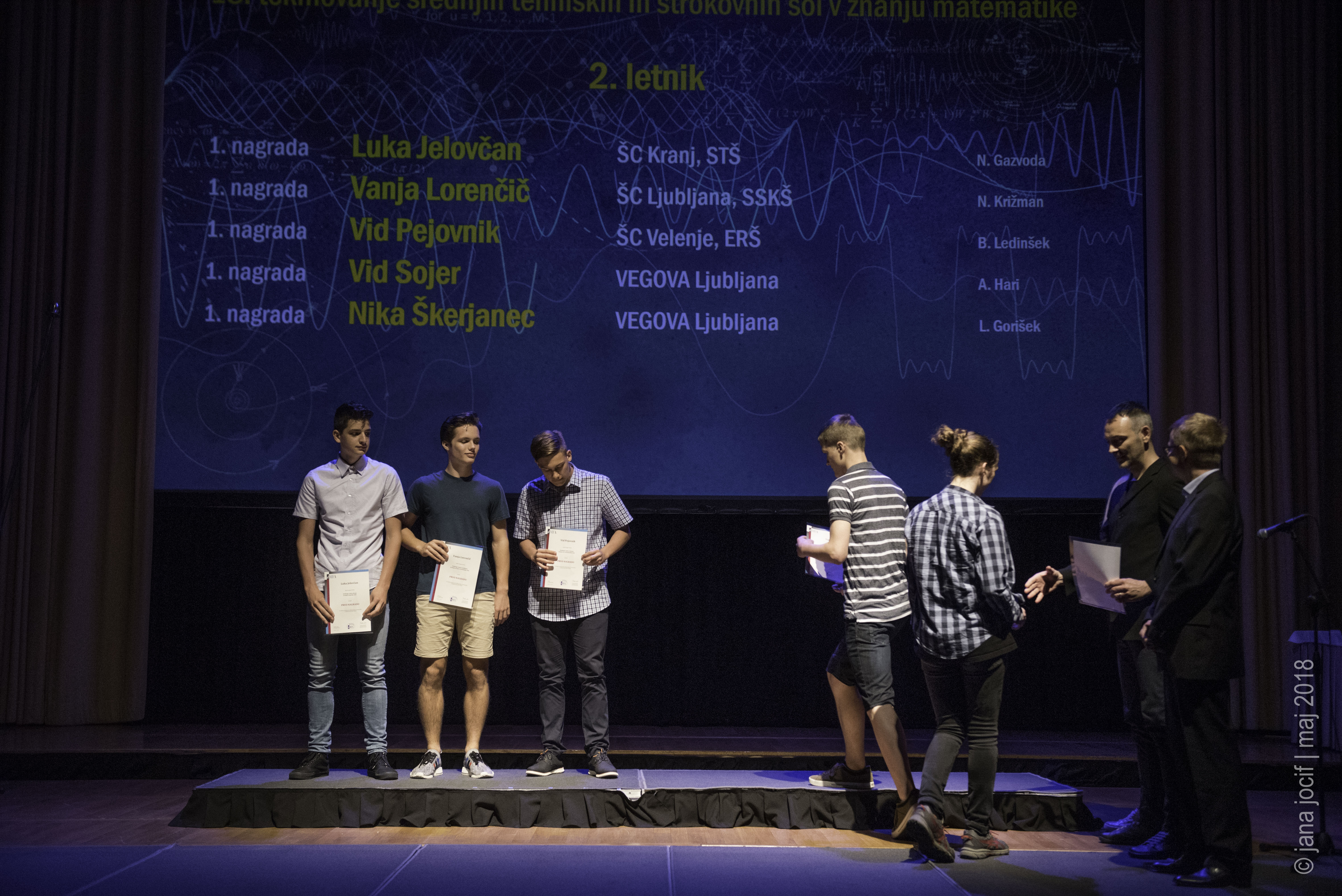 DMFA Slovenije dovoljuje shranitev slik v elektronski obliki in uporabo v individualne namene nagrajenih tekmovalcev. Uporaba posameznih slik na spletnih straneh šol ali v šolskih publikacijah je dovoljena, navesti je potrebno vir slik s povezavo na spletno stran DMFA Slovenije: <a href="http://www.dmfa.si/" title="DMFA Slovenije">www.dmfa.si</a>. Avtor slik: Jana Jocif.